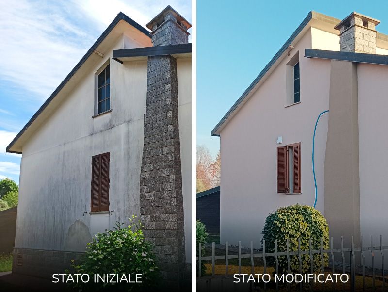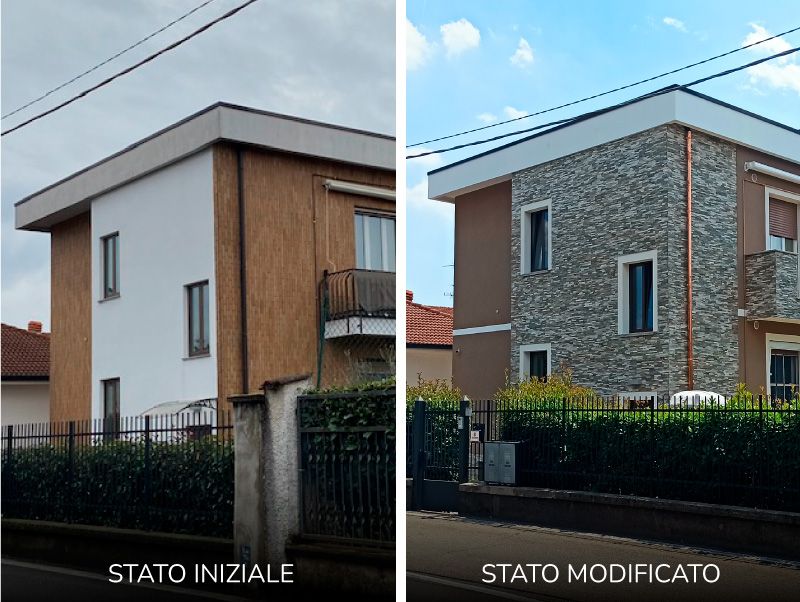 Le opere di manutenzione straordinaria realizzate comprendono la realizzazione di cappotto esterno in pannelli di polistirene espanso alla grafite, mediante la rimozione della finitura esistente in clinker, il progetto ha previsto un rivestimento in pietra naturale sul vano scala e zoccolatura e la sostituzione del parapetto del balcone realizzato in doghe di alluminio color antracite mentre il resto dell’edificio finito in intonachino colorato. È stato installato un impianto fotovoltaico di kw6, 3 per ogni unità immobiliare oggetto di intervento e un impianto di VMC puntuale per ogni unità.