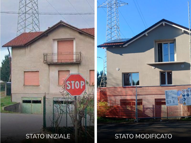 Le opere di manutenzione straordinaria realizzate comprendono la realizzazione di cappotto esterno in pannelli di polistirene espanso alla grafite, mediante la rimozione della finitura esistente in clinker, il progetto ha previsto un rivestimento in pietra naturale sul vano scala e zoccolatura e la sostituzione del parapetto del balcone realizzato in doghe di alluminio color antracite mentre il resto dell’edificio finito in intonachino colorato. È stato installato un impianto fotovoltaico di kw6, 3 per ogni unità immobiliare oggetto di intervento e un impianto di VMC puntuale per ogni unità.